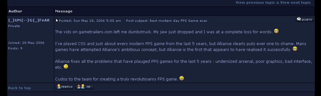 But we need your help in getting there. Many of you asked us what you could do to help ensure Alliance's release. Well, now there are several ways. The first is to like our Facebook page, follow us on Twitter, and subscribe to our YouTube channel (all via the buttons above and to the right). This way you'll get the latest news and updates on Alliance and have a way to interface directly with us. Secondly, you can really help us out by spreading the word: you all are what gave us our enormous launch the first time around, and we need you now again to make this a reality. So please blog, tweet, post, status update- do whatever you can to spread the word about Alliance!